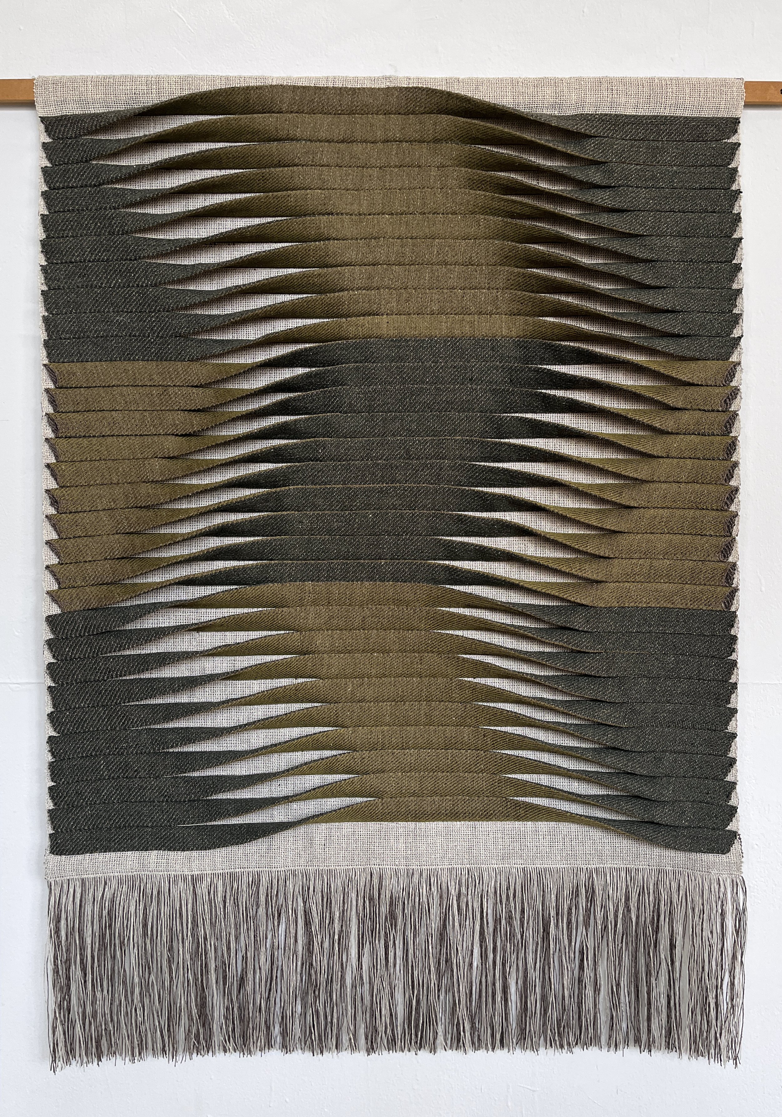 These reliefs primarily use a double weave technique where two warps are handwoven simultaneously. The pieces emerge from the loom three-dimensional, with the direction of the pleats hand manipulated into position.